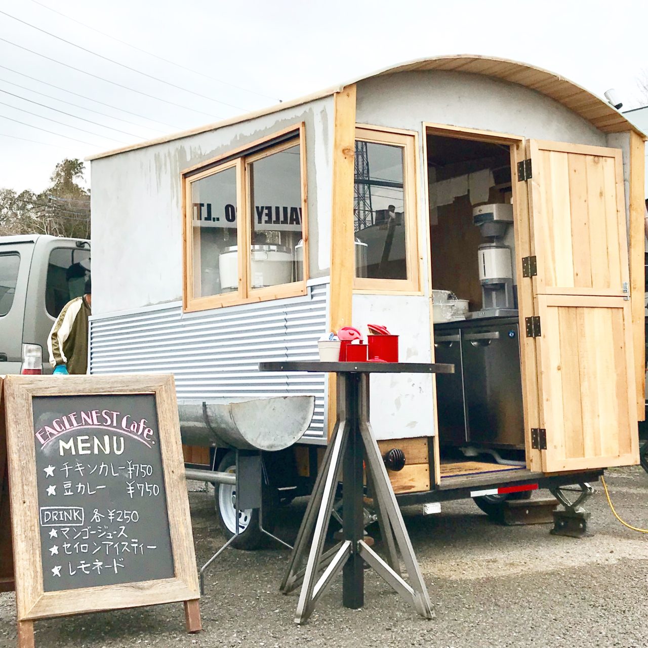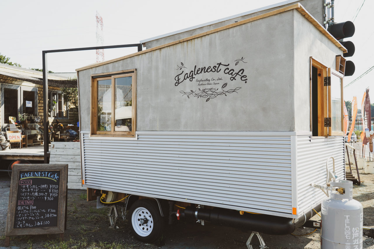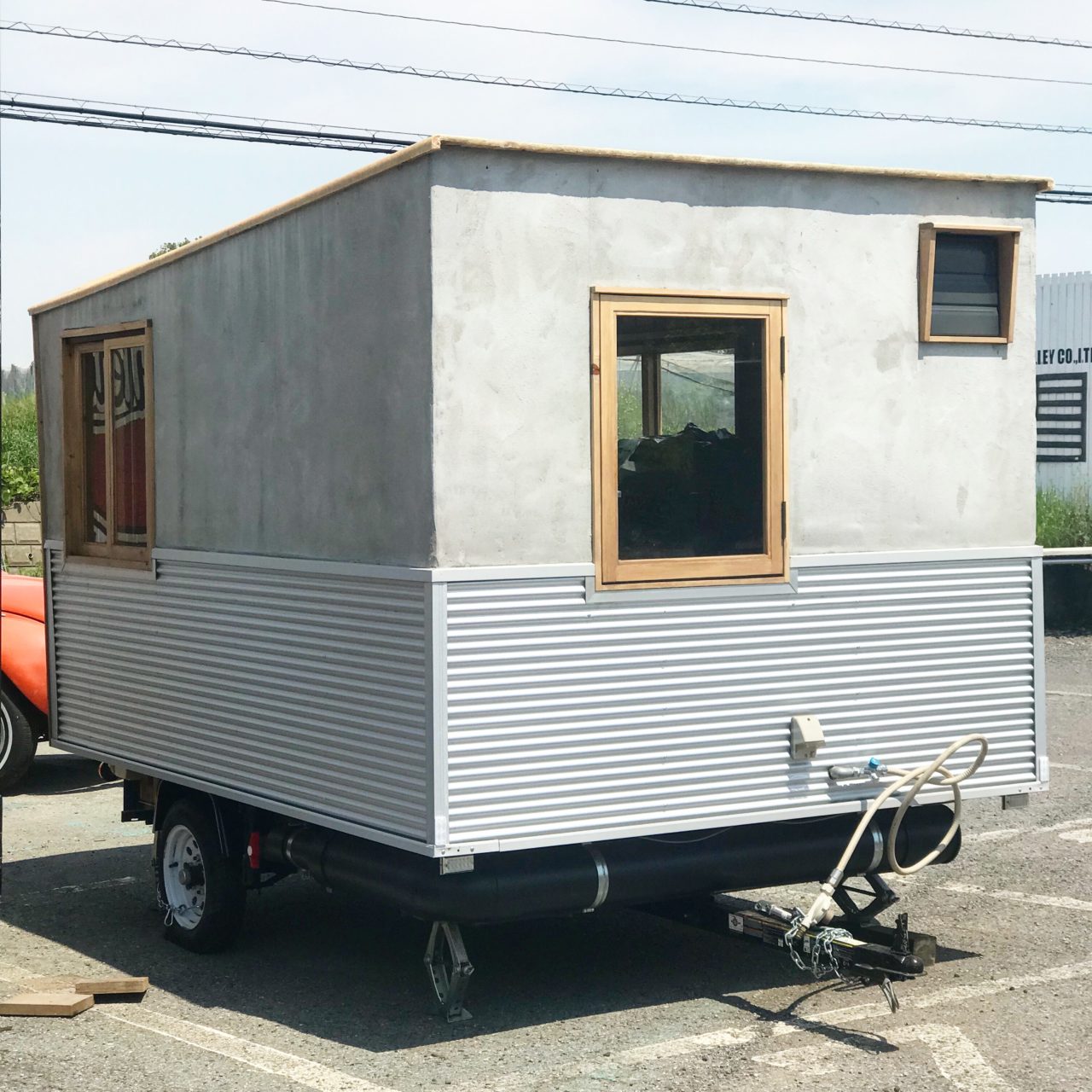 モルタルの外壁がシックな印象のフードカートトレーラー。木製のサッシやオリジナルのドア、アーチ天井が親しみのある雰囲気を感じさせます。車高をギリギリまで下げ、低床のハウス内は調理作業がしやすく、様々なフードメニューの調理にも対応します。大きな窓からフードの提供も可能。
